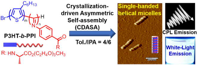 此外,该科研团队发现这种结晶驱动的不对称自组装可以诱导嵌段聚合物发出白光和圆偏振光。虽然聚噻吩-聚异腈嵌段共聚物本身不能发射圆偏振光,但是通过不对称自组装形成的螺旋棒状胶束却可以发射出明显的圆偏振光。胶束的长度可以调控圆偏振光的强度,组装体的螺旋方向可以控制圆偏振光的手性,从而可以实现对圆偏振光的有效调控。该研究工作发展了结晶驱动不对称自组装策略,实现了共轭高分子嵌段共聚物超分子螺旋结构的可控制备,并利用嵌段共聚物的分子手性诱导出超分子手性、白光和圆偏振光,为新型光学材料的制备提供了新的方法和研究思路。