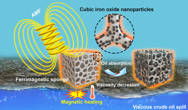 图2磁热效应助力铁磁性海绵快速回收海上高粘度浮油示意图。