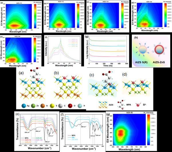 研究团队这一问题,利用过量无机S2-配体钝化银铟锌硫量子点(Ag-In-Zn-S QDs)的表面缺陷,系统地研究高密度供体-受体对(D-A对)在光催化过程中对载流子分离和转移路径的影响。通过密度泛函计算证明了过量无机S2-配体取代MPA的可行性。研究结果揭示,量子点中的D-A对缺陷可以有效地分离载流子,由其D-A对产生的固定能级位置的缺陷为光生电子-空穴的分离提供了新的路径,并能高效“储存”载流子。在此基础上,研究团队利用量子点内D-A对中存储的载流子与纳米片中的In空位形成的内建电场,构筑了类Z型量子点-纳米片异质结材料,性能测试表明,异质结的光催化产氢速率得到大幅提升,最高可达初始量子点产氢速率的近1400倍(80.7 mmol·g−1·h−1)。