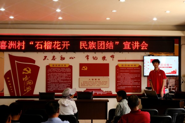 宣讲凝聚共识,筑牢精神家园。在喜洲村,实践队员化身“民族团结宣讲员”,面向村民开展“石榴花开,民族团结”主题政策宣讲活动,用平实的语言阐释国家民族政策要义,介绍高校支持少数民族学生发展的举措。通过案例和图片展示,深化了村民对民族团结重要性的认识。活动尾声,全体人员共同宣读了《民族团结进步承诺书》,表达维护团结、共建家园的共同愿景。